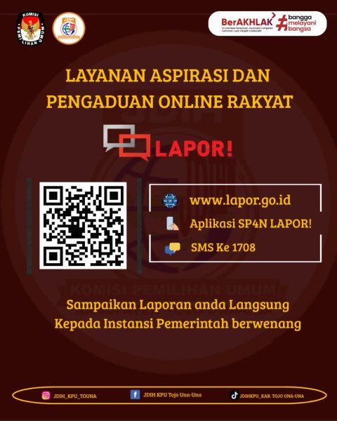 Halo, #TemanPemilih, Sampaikan Laporan Anda Melalui SP4N LAPOR!. Layanan Aspirasi dan Pengaduan Online Rakyat KPU Kabupaten Tojo Una-Una mengajak masyarakat untuk menyampaikan aspirasi, pengaduan, atau permintaan informasi secara mudah dan langsung kepada instansi pemerintah berwenang melalui SP4N LAPOR! Aduan yang disampaikan dengan jelas, lengkap, dan sesuai prosedur akan membantu pemerintah untuk memberikan pelayanan yang lebih baik bagi masyarakat Silahkan pindai barcode yang tersedia atau dapat mengunjungi www.lapor.go.id atau melalui aplikasi SP4N LAPOR serta kirim SMS ke 1708 Kalian juga dapat mengikuti sosial media kami agar Selalu update informasi hukum lainnya dari JDIH KPU Kabupaten Tojo Una-Una. jangan sampai sobat ketinggalan. Terima Kasih ....