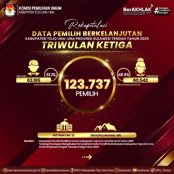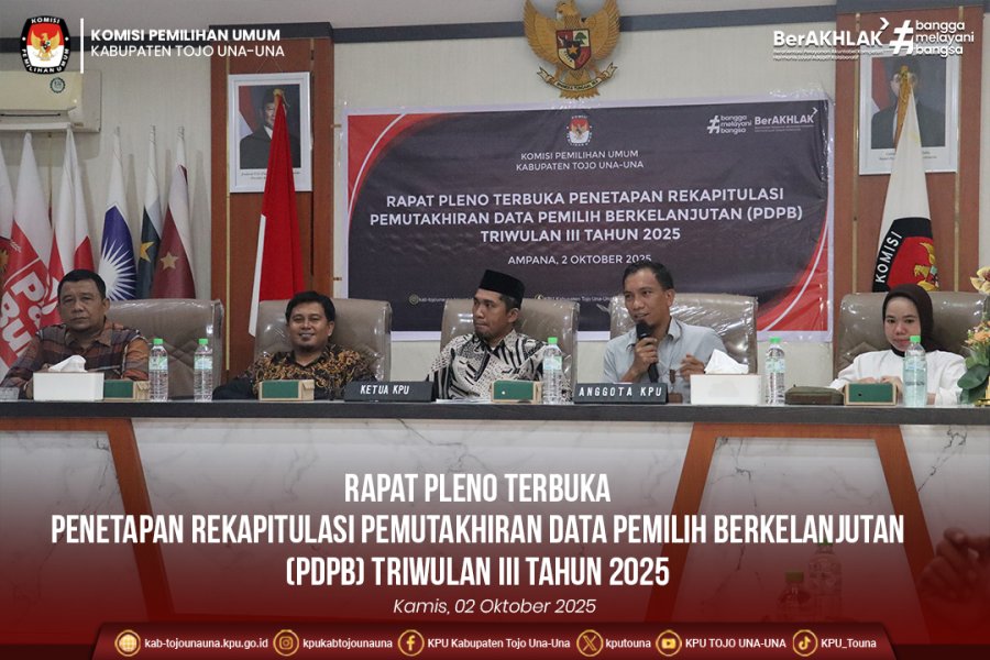 #TemanPemilih, KPU Kab. Tojo Una-Una menggelar Rapat Pleno Terbuka Penetapan Rekapitulasi Pemutakhiran Data Pemilih Berkelanjutan (PDPB) Triwulan III Tahun 2025 bertempat di Kantor KPU Kabupaten Tojo Una-Una Ampana, Kamis (2/10/25).