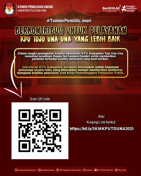 Dalam rangka peningkatan kualitas pelayanan, KPU Kabupaten Tojo Una-Una memohon kesediaan Bapak/Ibu/Saudara/Saudari untuk memberikan penilaian terhadap kualitas pelayanan yang kami berikan.