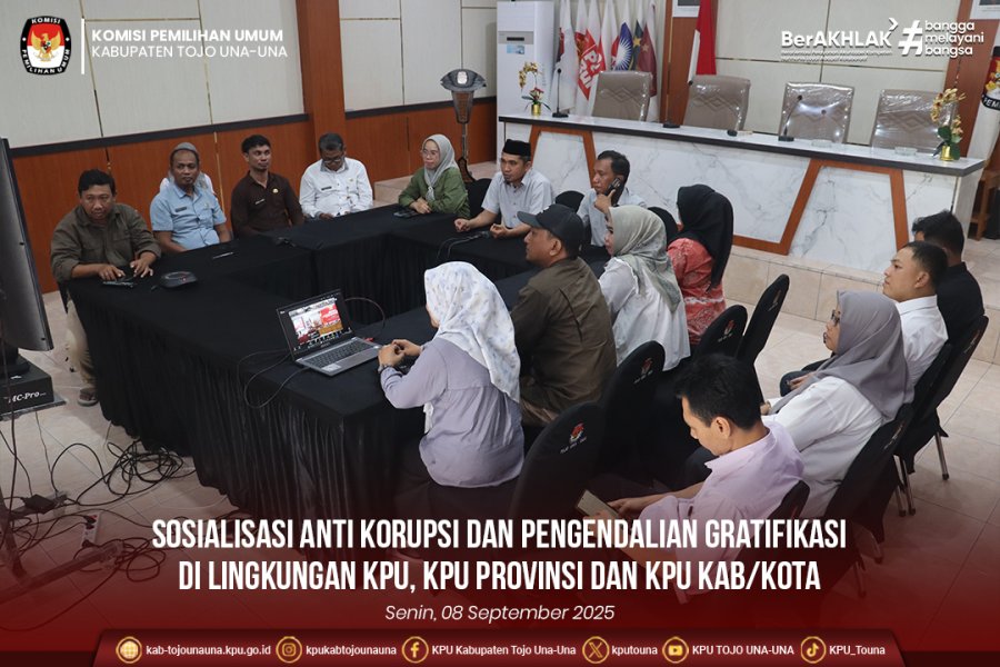 #TemanPemilih, Ketua dan Anggota KPU Kabupaten Tojo Una-Una didampingi jajaran Kasubag mengikuti Sosialisasi Anti Korupsi dan Pengendalian Gratifikasi di Lingkungan Komisi Pemilihan Umum, Komisi Pemilihan Umum Provinsi, dan Komisi Pemilihan Umum Kabupaten/Kota secara daring yang diselenggarakan oleh KPU Republik Indonesia. Senin, (08/09/25).
