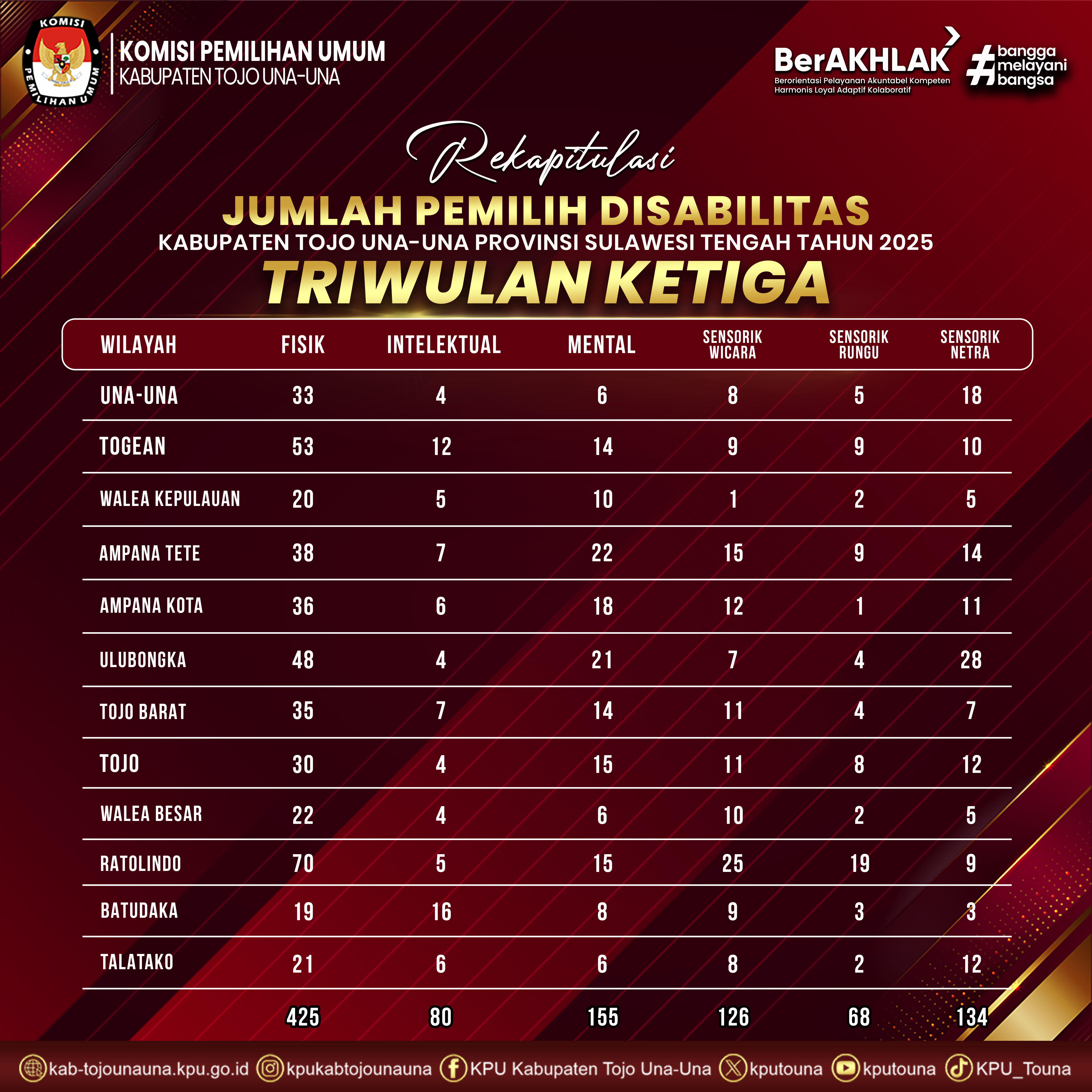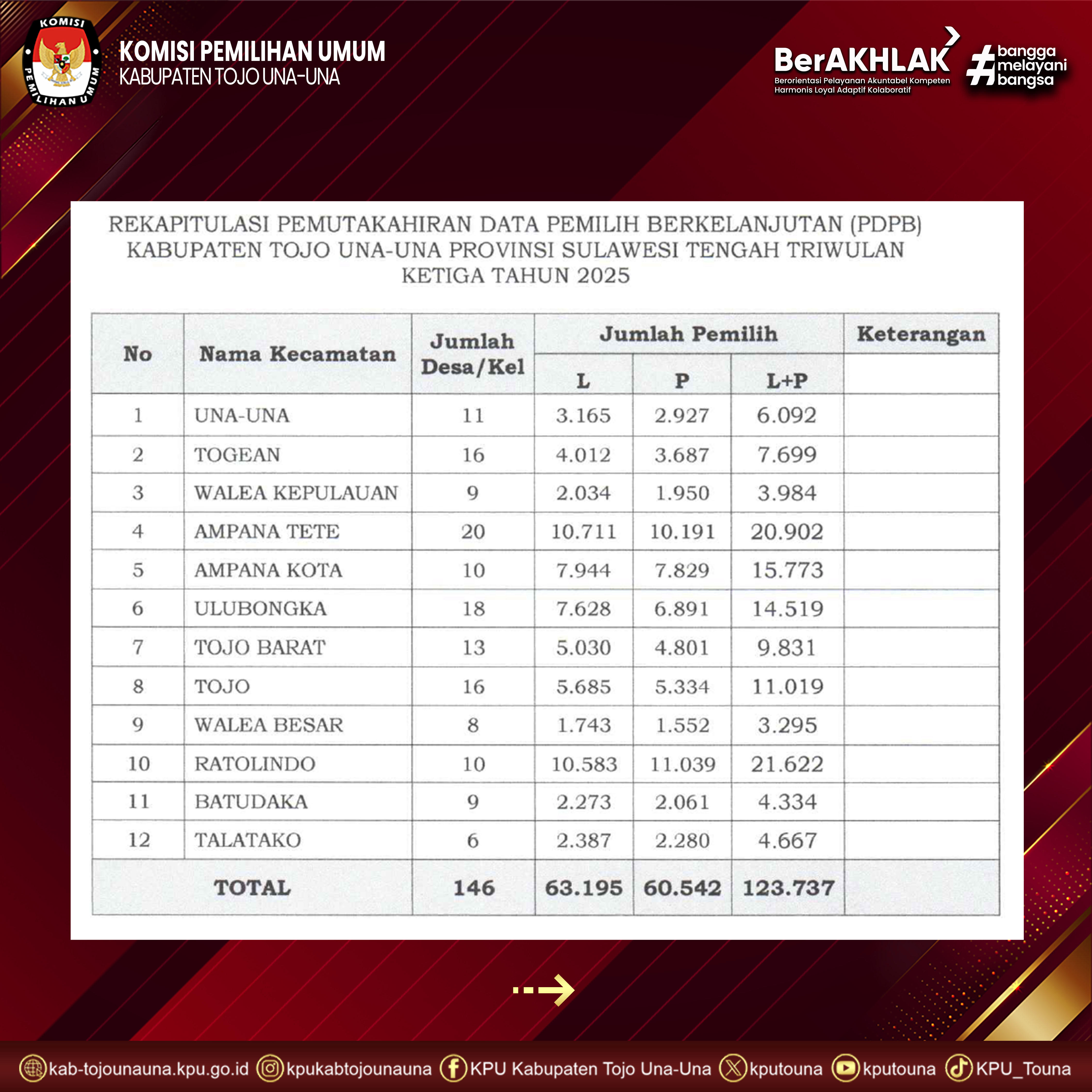 Hi #TemanPemilih, berikut adalah infografis Rekapitulasi Data Pemilih Berkelanjutan Kabupaten Tojo Una-Una Provinsi Sulawesi Tengah untuk Triwulan ketiga tahun 2025, yuk simak sampai slide terakhir..