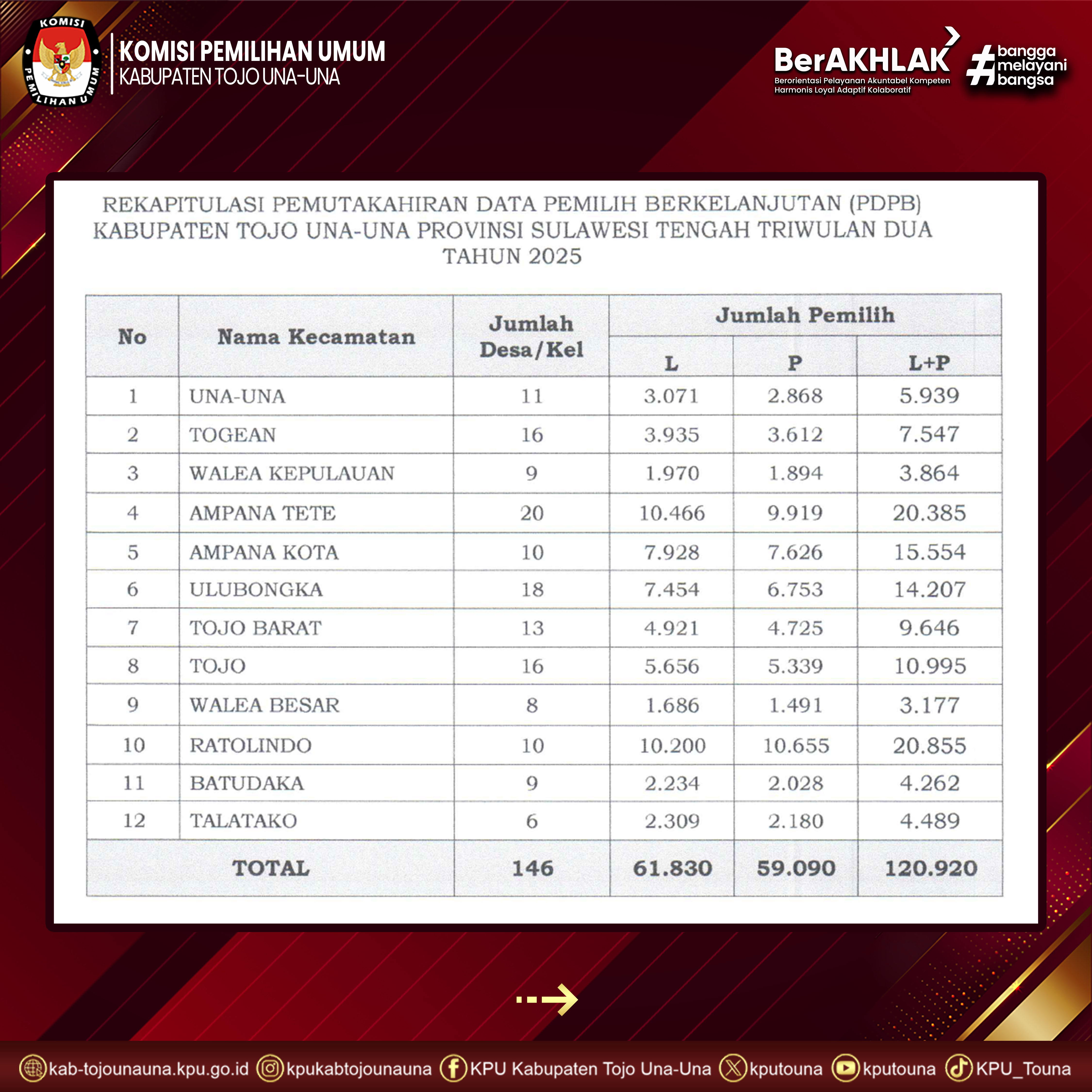 Hi #TemanPemilih, berikut adalah infografis Rekapitulasi Data Pemilih Berkelanjutan Kabupaten Tojo Una-Una Provinsi Sulawesi Tengah untuk Triwulan kedua tahun 2025, yuk simak sampai slide terakhir..