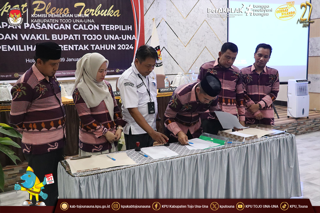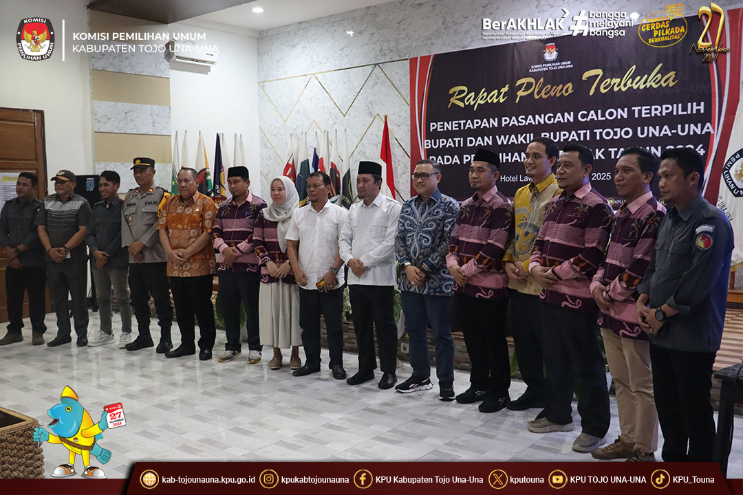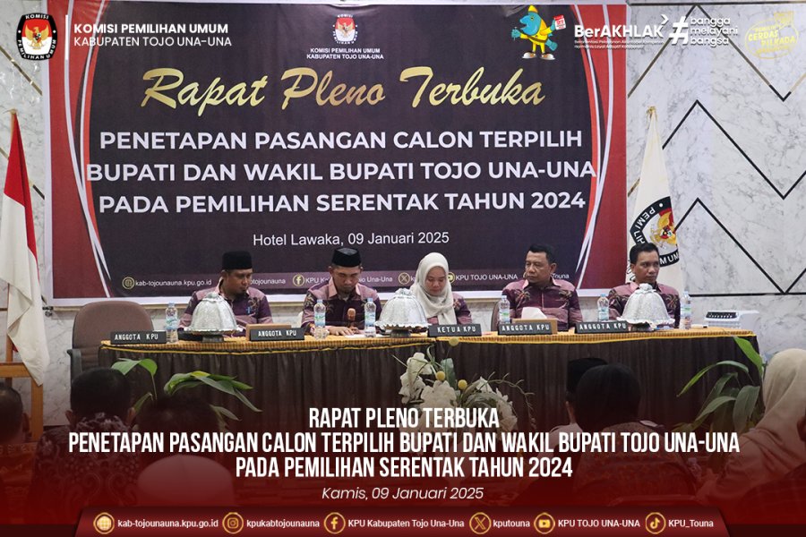Rapat pleno ini menetapkan Pasangan Calon Bupati dan Wakil Bupati Tojo Una-Una Nomor Urut 2, Ilham, S.H. dan Surya, S.Sos., M.Si. sebagai Calon Bupati dan Calon Wakil Bupati Tojo Una-Una Terpilih pada Pemilihan Serentak Tahun 2024.