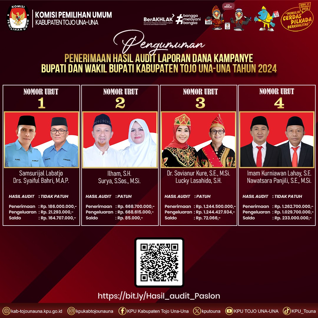 PENERIMAAN HASIL AUDIT LAPORAN DANA KAMPANYE PEMILIHAN BUPATI DAN WAKIL BUPATI KABUPATEN TOJO UNA-UNA TAHUN 2024 Jumat, 13 Desember 2024 21:00 449 Download dokumen, selengkapnya klik disini Bagikan: Telah dilihat 449 kali