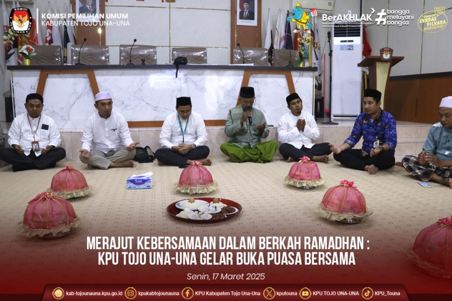 #TemanPemilih, Alhamdulillah, dalam suasana penuh kebersamaan dan kehangatan, KPU Kab. Tojo Una-Una telah melaksanakan kegiatan Buka Puasa Bersama sebagai bentuk silaturahmi dan mempererat tali persaudaraan. Kegiatan ini dilaksanakan dilingkungan Kantor KPU Kab. Tojo Una-Una Senin, (17/03/25). Momen ini bukan hanya sekadar berbagi hidangan, tetapi juga menjadi ajang untuk memperkuat kebersamaan, meningkatkan kepedulian, serta menumbuhkan semangat kebersamaan di bulan suci Ramadhan. Semoga kebersamaan ini semakin mempererat tali silaturahmi dan membawa keberkahan bagi kita semua. Terima kasih kepada semua pihak yang telah berpartisipasi dalam kegiatan ini. Hadir dalam kegiatan ini Ketua dan Anggota KPU Kab. Tojo Una-Una, Sekretaris bersama jajaran Kasubag KPU Kab. Tojo Una-Una serta pegawai KPU Kab. Tojo Una-Una. Turut hadir sebagai undangan jajaran Bank Syariah Indonesia Cabang Ampana, Bawaslu Kab. Tojo Una-Una, momen ini juga dirangkaikan dengan pemberian sertifikat penghargaan oleh KPU Kab. Tojo Una-Una kepada Bank BSI Cabang Ampana sebagai bentuk apresiasi atas peran dalam menyediakan layanan perbankan untuk mendukung kelancaran dalam proses pelaksanaan tahapan pemilihan Bupati dan Wakil Bupati Kab. Tojo Una-Una tahun 2024, serta penyerahan hibah berupa 1 unit mobil pick up oleh Bank BSI Cabang Ampana kepada KPU Kab. Tojo Una-Una. Ramadhan penuh berkah, kebersamaan penuh makna! ✨ #KPUMelayani #KPUTojoUnaUna
