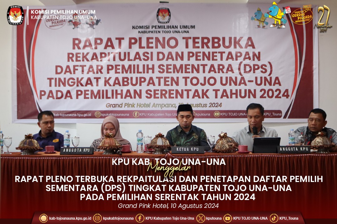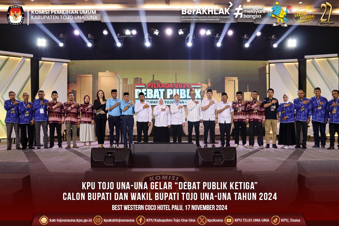 #TemanPemilih, KPU Kabupaten Tojo Una-Una menggelar Debat Publik Ketiga Calon Bupati dan Wakil Bupati Tojo Una-Una Tahun 2024 bertempat di Best Western Coco Hotel Palu, Minggu (17/11/2024). Ketua KPU Kabupaten Tojo Una-Una Ahdin L. Nondo hadir bersama Anggota KPU Kabupaten Tojo Una-Una Naser Lahay, Zakaria, Nidaul dan Arpan Patanda didampingi Sekretaris KPU Kabupaten Tojo Una-Una Moh. Fitra Akbar bersama jajaran Kasubag KPU Kab. Tojo Una-Una serta jajaran staf sekretariat KPU Kab. Tojo Una-Una. Hadir secara langsung Pasangan Calon Bupati dan Wakil Bupati Tojo Una-Una, Sekretaris Daerah Kab. Tojo Una-Una, para panelis debat publik ketiga, pimpinan partai politik, LO dan Tim Kampanye dari masing-masing pasangan calon, Bawaslu Kab. Tojo Una-Una, Polres Tojo Una-Una, Kejaksanaan Negeri Tojo Una-Una, FORKOPIMDA Kab. Tojo Una-Una serta rekan-rekan Media cetak dan elektronik. Dalam sambutannya, Ahdin menyampaikan debat publik ketiga sekaligus yang terkahir ini kembali dilaksanakan dalam upaya KPU mengoptimalkan fasilitasi terhadap peserta pemilihan di Kabupaten Tojo Una-Una juga sebagai upaya untuk memberikan pemahaman, pendidikan pemilih kepada seluruh pemilih yang ada di Kabupaten Tojo Una-Una untuk memberikan pertimbangan pemilih dalam menentukan pilihannya pada 27 November mendatang. Ahdin juga menyampaikan mewakili keluarga besar KPU Kabupaten Tojo Una-Una mengucapkan terima kasih kepada semua pihak, televisi penyelenggara siaran debat, panelis dan moderator yang memandu debat publik ketiga ini, teristimewa kepada seluruh jajaran adhoc PPK maupun PPS se Kabupaten Tojo Una-Una, Ahdin berharap semoga perhelatan pilkada serentak tahun 2024 berjalan aman dan damai. [Humas KPU Tojo Una-Una:Aban/Foto:Aban/Editor:Aban] #KPUMelayani #PilkadaSerentak2024
