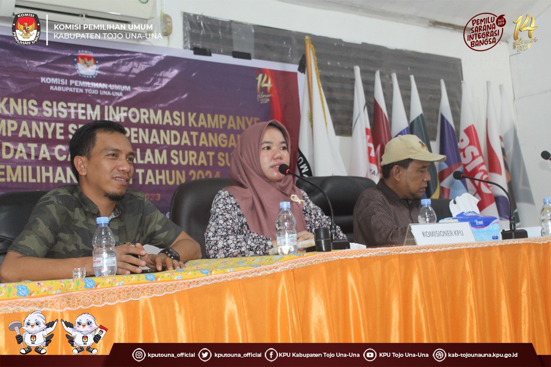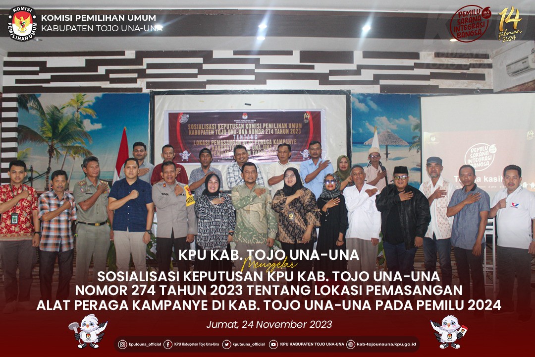 Ampana, kab-tojounauna.kpu.go.id - Plh Katua KPU Kabupaten Tojo Una-Una, Naser Lahay dalam mengisi kegiatan sosialisasi Keputusan KPU Kab. Tojo Una-Una Nomor 274 Tahun 2023, tentang lokasi pemasangan Alat Peraga Kampanye (APK) kepada Partai Politik bertempat di Lawaka Hotel Ampana, Jumat, (24/11/2023). Naser Lahay didampingi Kasubag Teknis Penyelenggaraan Pemilu, Partisipasi dan Hubungan Masyarakat, Abdul Muthalib bersama Staf ASN, PPNPN Sekretariat KPU Kab. Tojo Una-Una dalam Sosialisasi tersebut. Kegiatan ini merupakan tindak lanjut KPU Tojo Una-Una bersama stakeholder terkait untuk kesiapan melaksanakan tahapan tersebut di kabupaten Tojo Una-Una pada Pemilihan Umum tahun 2024. Stakeholder terkait yakni Kejaksaan Negeri Tojo Una-Una, Polres Tojo Una-Una, Bawaslu Kab. Tojo Una-Una, Tata Pemerintahan Kab. Tojo Una-Una, Kesbangpol Kab. Tojo Una-Una, Dinas Perhubungan dan Lingkungan Hidup Kab. Tojo Una-Una dan Satpol PP Kab. Tojo Una-Una melakukan suatu Rapat Koordinasi mengenai lokasi pemasangan alat peraga kampanye sehingga menemukan suatu kesepakatan yang dituangkan dalam Keputusan KPU Kab. Tojo Una-Una Nomor 274 Tahun 2023. Masa kampanye akan berlangsung selama 75 hari, dimulai dari tanggal 28 November 2023 s.d 10 Februari 2024 oleh Partai Politik di Tiga Daerah Pemilihan kabupaten Tojo Una-Una, Keputusan ini dapat menjadi acuan untuk ditaati oleh seluruh partai politik di Kabupaten Tojo Una-Una demi kesuksesan Pemilu Serentak Tahun 2024. Undangan yang hadir Bawaslu Kab. Tojo Una-Una, Kejaksaan Negeri Tojo Una-Una, Polres Tojo Una-Una, Kesbangpol Kab. Tojo Una-Una, Satpol PP Kab. Tojo Una-Una, Pimpinan Partai Politik Peserta Pemilu Tahun 2024 serta Media.[Humas KPU Tojo Una-Una Fandi/Foto:Aban/Abdul Mutalib]