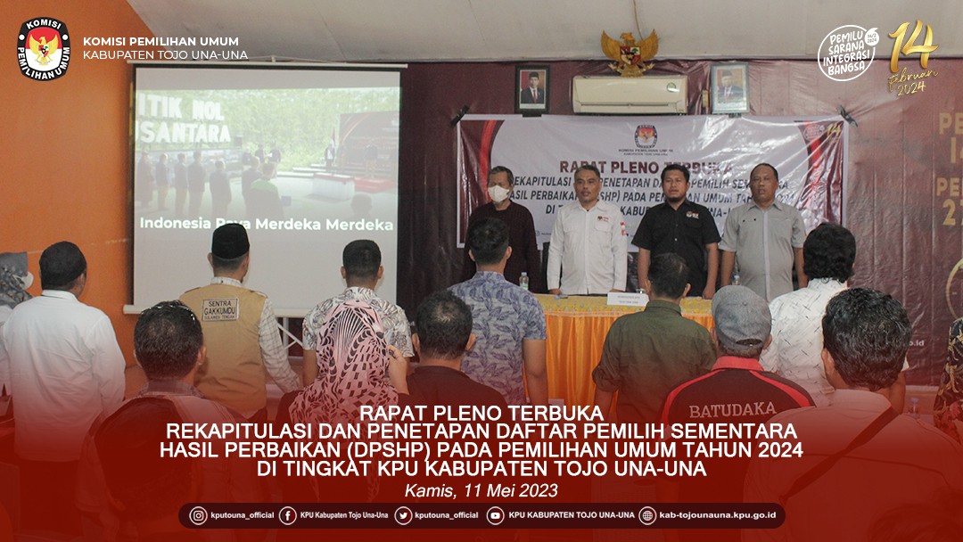 Komisi Pemilihan Umum (KPU) Kabupaten Tojo Una-Una menggelar Rapat Pleno Terbuka Rekapitulasi dan Penetapan Daftar Pemilih Sementara Hasil Perbaikan (DPSHP) pada Pemilihan Umum tahun 2024 di tingkat KPU Kabupaten Tojo Una-Una. (Kamis 11 Mei 2023)