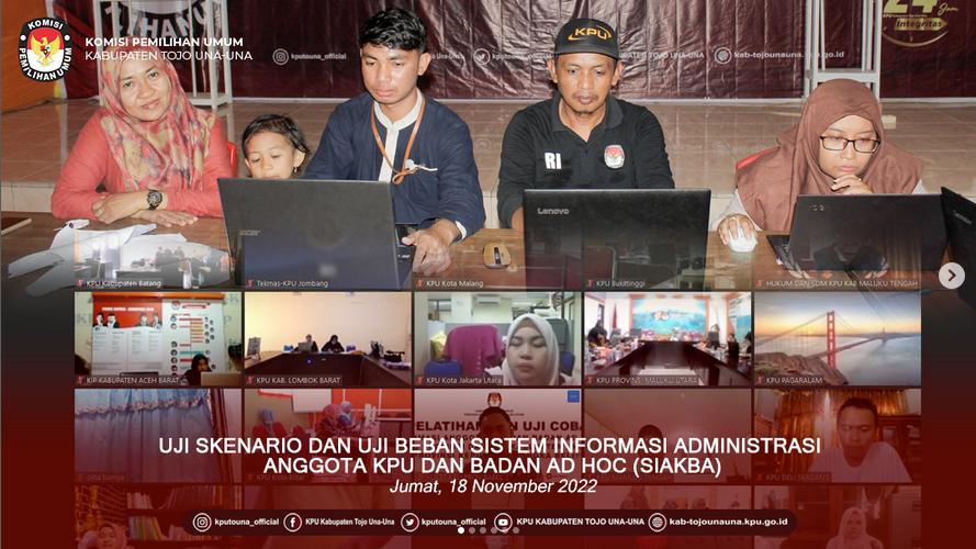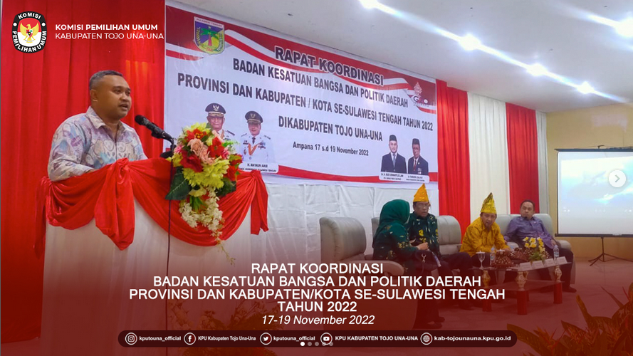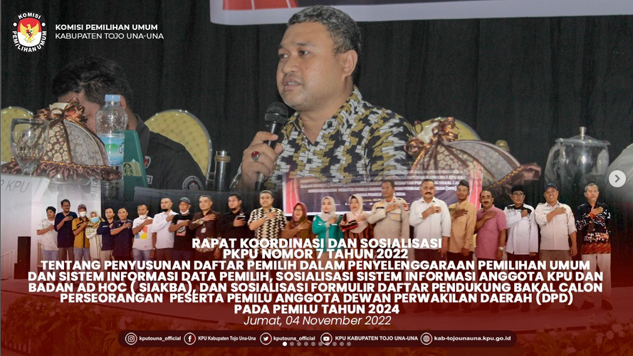 Komisi Pemilihan Umum melaksanakan kegiatan Rapat Koordinasi dan Sosialisasi PKPU nomor 7 Tahun 2022 tentang Penyusunan Daftar Pemilih dalam Penyelenggaraan Pemilihan Umum dan Sistem Informasi Data Pemilih, Sosialisasi Sistem Informasi Anggota KPU dan Badan Ad Hoc (SIAKBA), dan Sosialisasi Formulir Daftar Pendukung Bakal Calon Perseorangan Peserta Pemilu Anggota Dewan Perwakilan Daerah (DPD) pada Pemilu Tahun 2024. Jumat (04/11/2022)