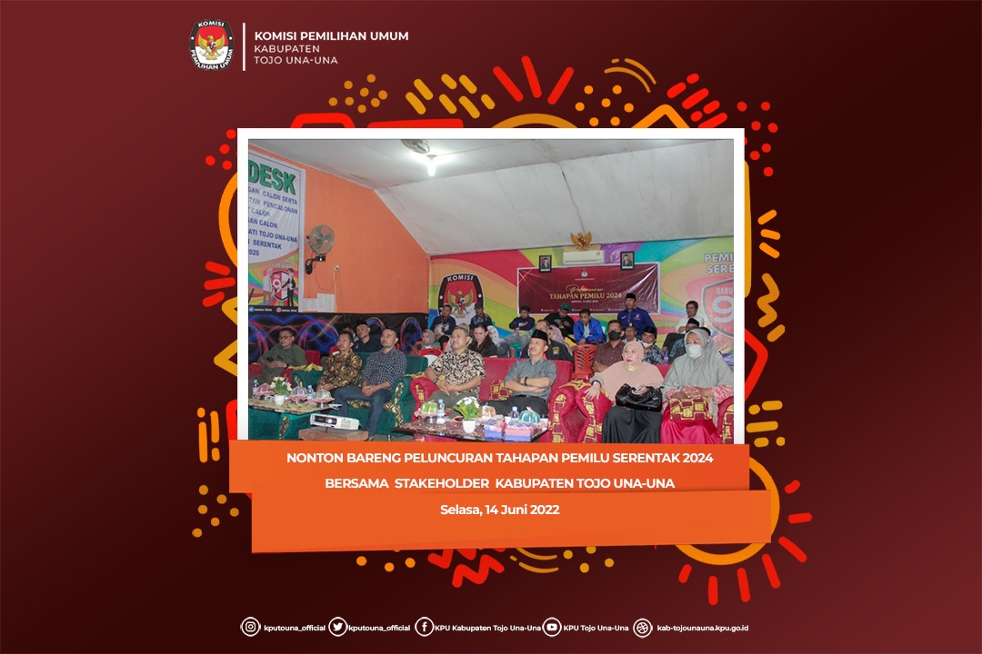 KPU Kabupaten Tojo Una-Una menggelar Nonton Bareng "Peluncuran Tahapan Pemilu 2024", Kegiatan ini dihadiri oleh seluruh Pejabat Struktural, Pejabat Fungsional, Bawaslu, Forkopimda, Stakeholder, Partai Politik serta Rekan Media bertempat di Aula Kantor KPU Kabupaten Tojo Una-Una, (Selasa, 14 Juni 2022).