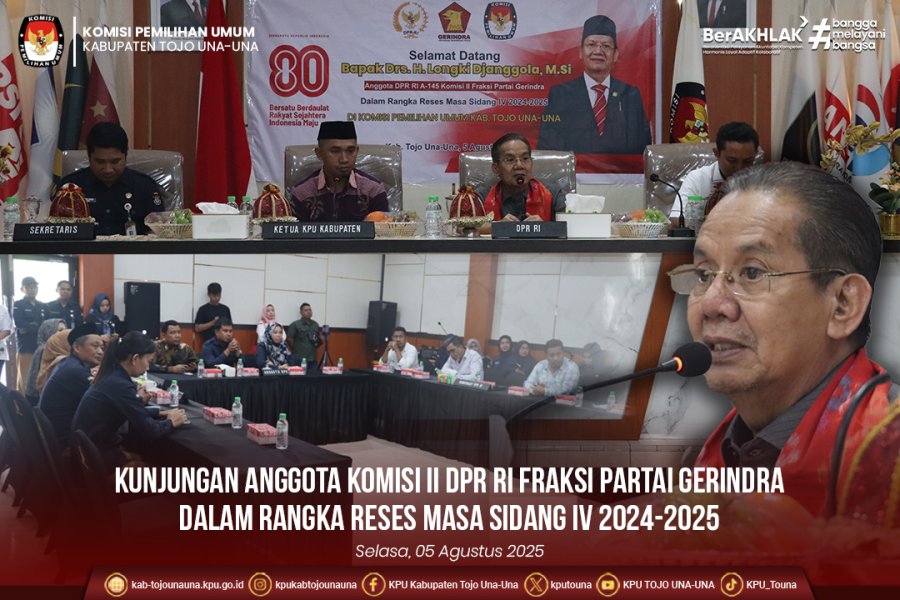 #TemanPemilih, KPU Kab. Tojo Una-Una menerima kunjungan Anggota Komisi II DPR RI Fraksi Partai Gerindra Drs. H. Longki Djanggola, M.Si di Kantor KPU Kabupaten Tojo Una-Una Ampana, Selasa (5/8/25).