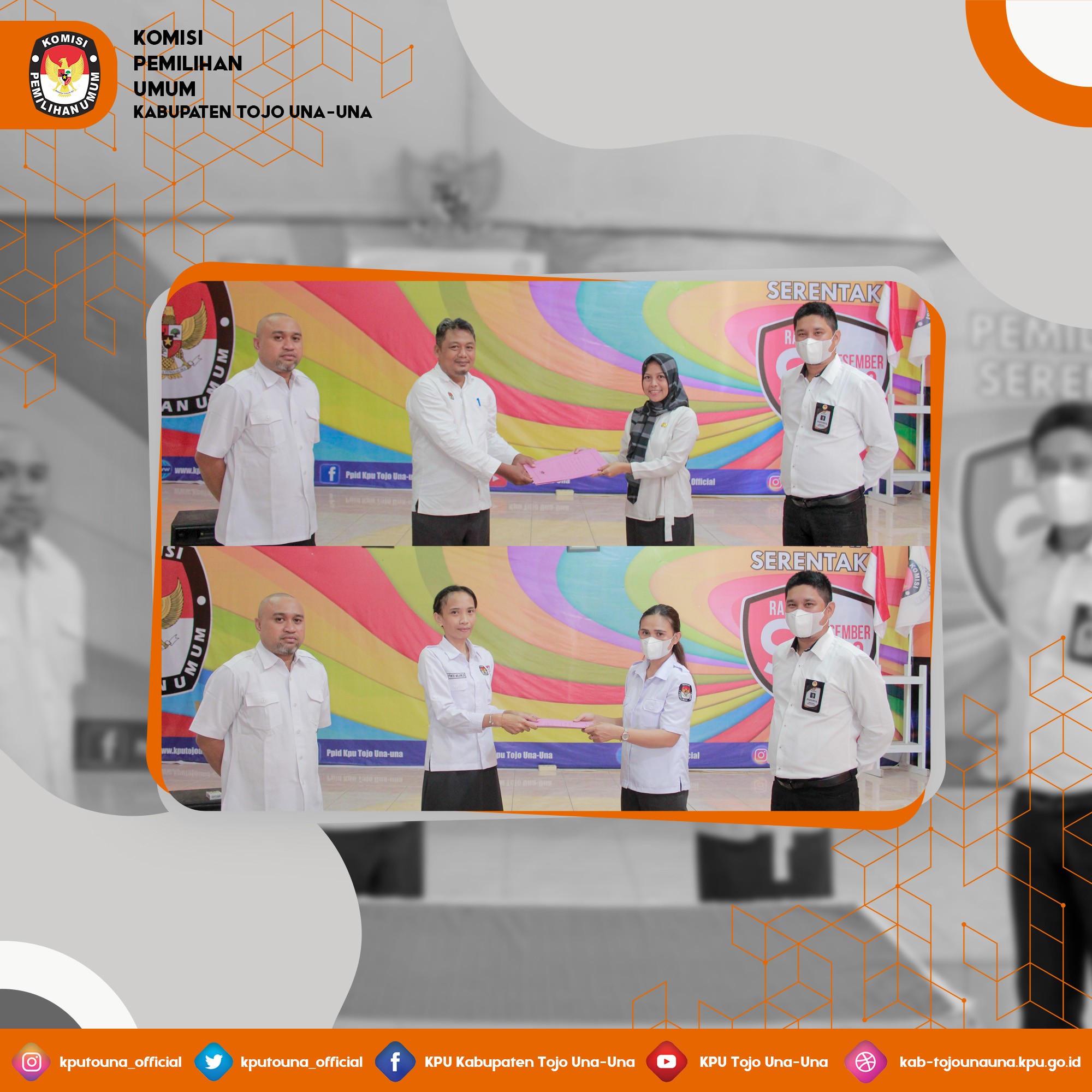 Telah dilaksanakan Serah Terima Jabatan di Lingkungan KPU Kabupaten Tojo Una-Una, dari jabatan sebelumnya ibu Yultutikce Malaini, SE sebagai kepala sub bagian Program dan Data di serahkan kepada Ibu Veranica M Paulina, SE Dan selanjutnya adanya perubahan nomenklatur SDM yang melekat pada Sub Bagian Hukum, yang sebelumnya dilaksanakan di Sub Bagian Keuangan, Umum dan Logistik. Di serah terima kan dari pejabat sebelumnya ibu Fadliani, S.Sos kepada Bpk. Abdul Mutalib, SH selaku Kasubag Hukum dan SDM.