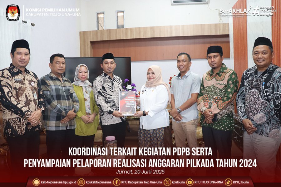 #TemanPemilih, KPU Kab. Tojo Una-Una melakukan kunjungan ke Pemerintah Daerah Kabupaten Tojo Una-Una dalam rangka koordinasi terkait kegiatan Pemutakhiran Data Pemilih Berkelanjutan (PDPB), pelaksanaan kegiatan pendidikan pemilih serta penyampaian pelaporan realisasi anggaran Pilkada tahun 2024 bertempat di Kantor Bupati Kabupaten Tojo Una-Una Ampana, Jumat (20/06/2025).