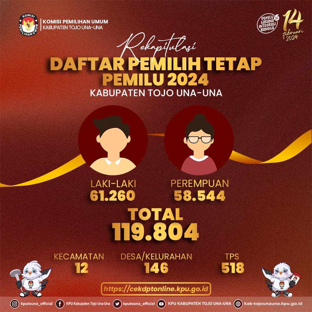 Ketua KPU Kabupaten Tojo Una-Una, Sahlan Sabu, S.Pd.I menyampaikan Rekapitulasi Daftar Pemilih Tetap (DPT) Kabupaten Tojo Una-Una dengan jumlah pemilih 119.804 dari jumlah Kecamatan sebanyak 12, jumlah Desa/Kelurahan 146, dan jumlah TPS sebanyak 518.