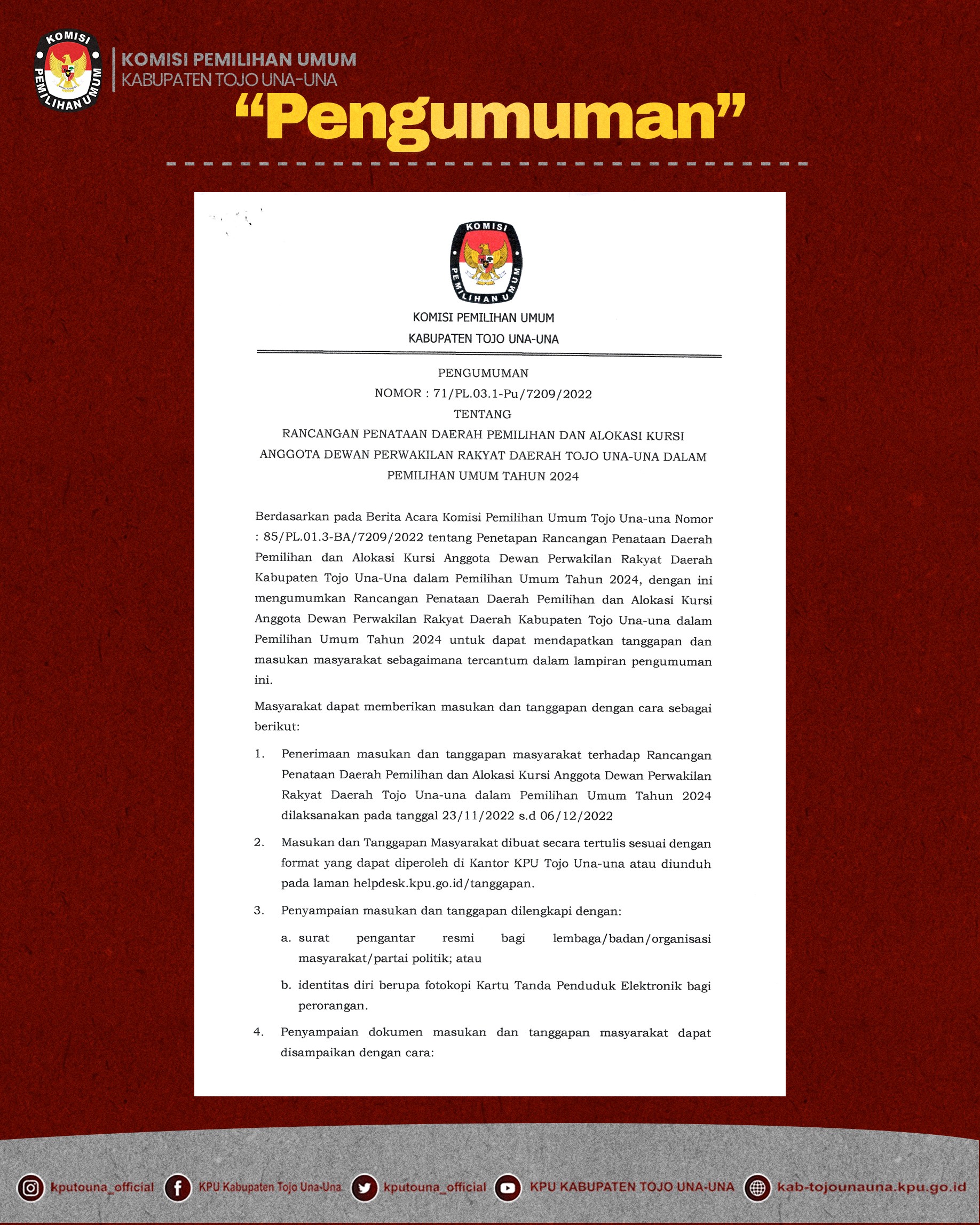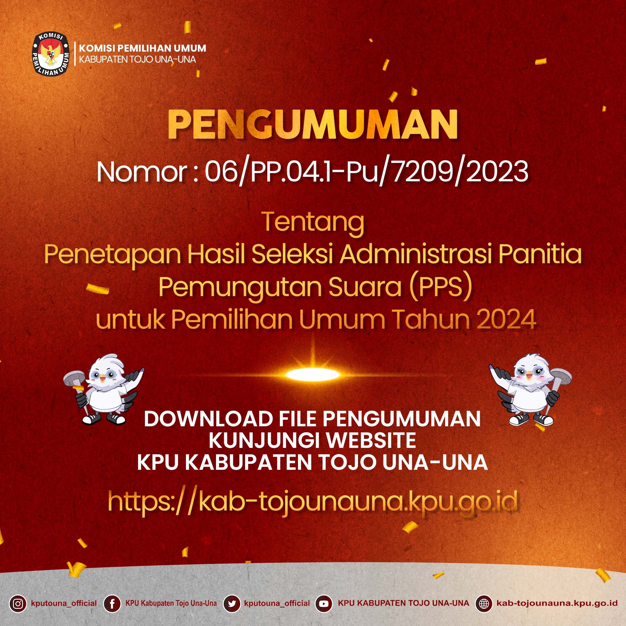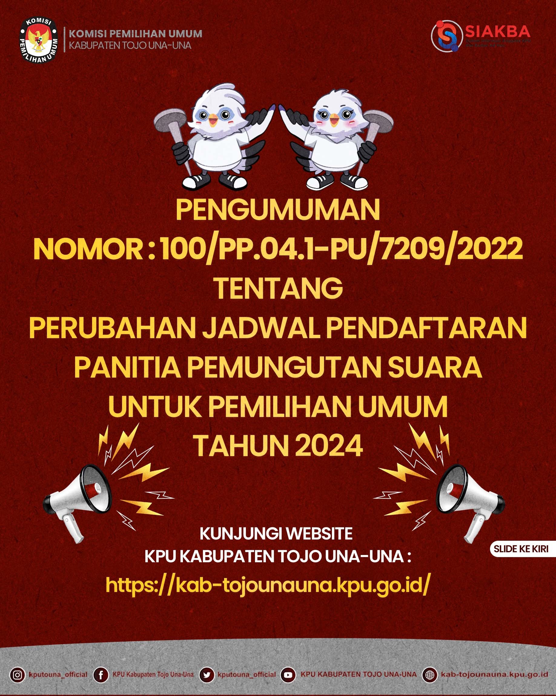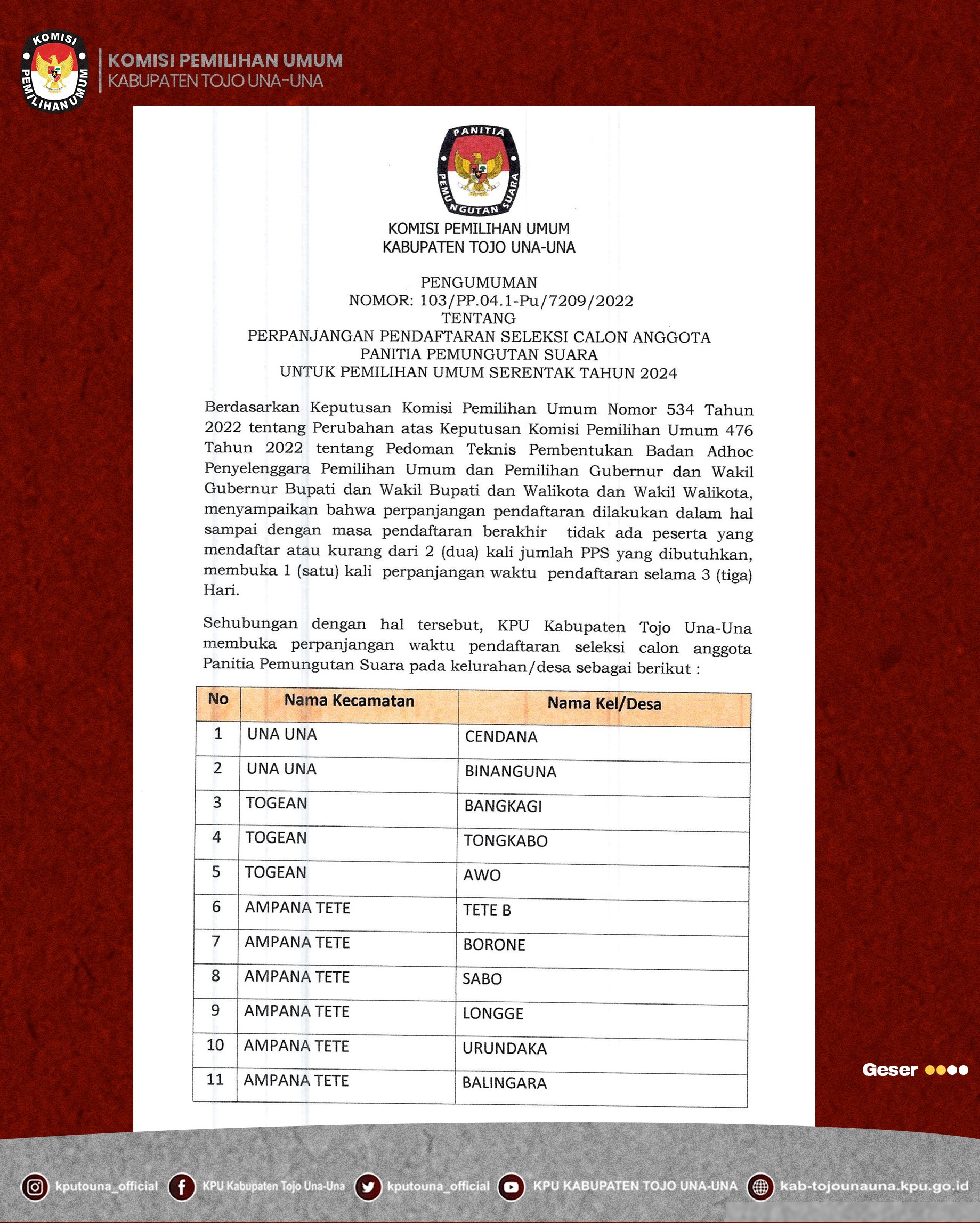 Teman Pemilh berikut ini Pengumuman nomor: 103/PP.04.1.Pu/7202/2022 tentang perpanjangan pendaftaran seleksi calon anggota Panitia Pemungutan Suara untuk pemilihan umum serentak tahun 2024. Berdasarkan Keputusan Komisi Pemilihan Umum Nomor 534 Tahun 2022 tentang Perubahan atas Keputusan Komisi Pemilihan Umum 476 Tahun 2022 tentang Pedoman Teknis Pembentukan Badan Adhoc Penyelenggara Pemilihan Umum dan Pemilihan Gubernur dan Wakil Gubernur Bupati dan Wakil Bupati dan Walikota dan Wakil Walikota, menyampaikan bahwa perpanjangan pendaftaran dilakukan dalam hal sampai dengan masa pendaftaran berakhir tidak ada peserta yang mendaftar atau kurang dari 2 (dua) kali jumlah PPS yang dibutuhkan, membuka 1 (satu) kali perpanjangan waktu pendaftaran selama 3 (tiga) Hari.